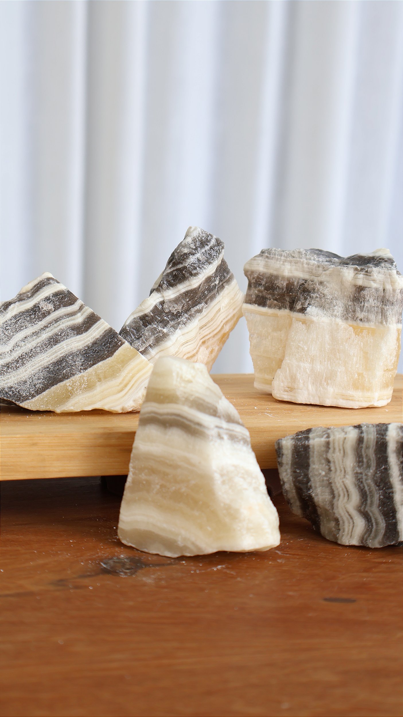 A Calcita Zebra é um cristal marcante, com listras naturais em tons de claro e escuro que simbolizam a união dos opostos: luz e sombra, mente e corpo, espiritual e material.