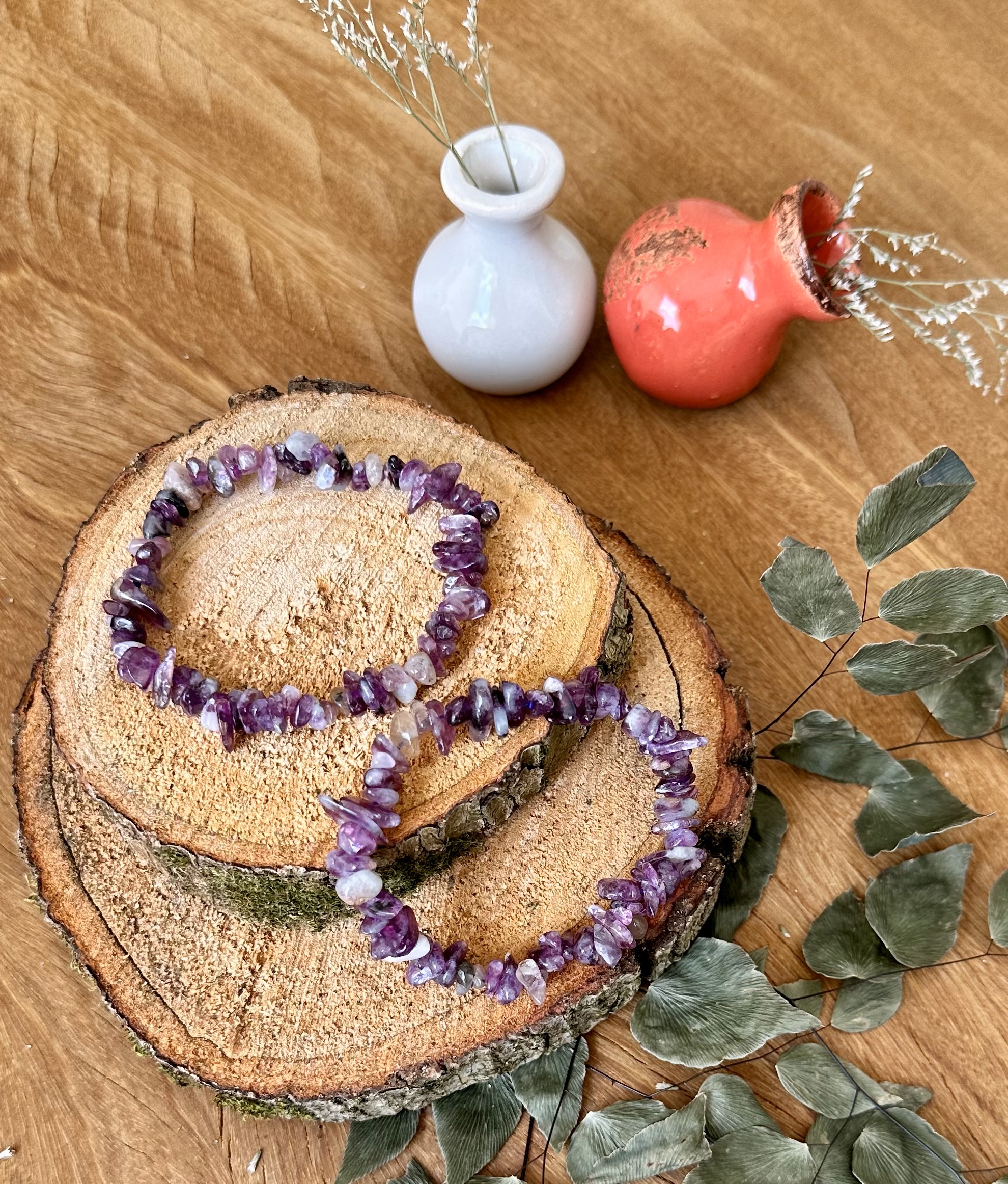 Para acalmar a mente e restaurar o equilíbrio emocional, combine as pulseiras de Lepidolita, Ametista, Howlita e Água Marinha — cristais que emanam serenidade e proteção emocional.
