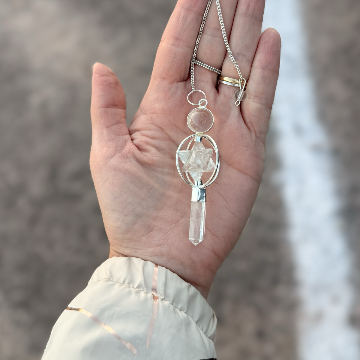 🔮 Pêndulo de Cristal com Esfera, Ponta de Quartzo e Merkaba – Intuição, Expansão e Geometria Sagrada